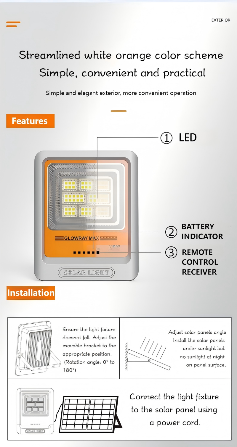 Solar flood lights equipped with 96pcs powerful LED and optical lens improve 20% light efficiency, turn the dark space into a bright lighted space from dusk to dawn